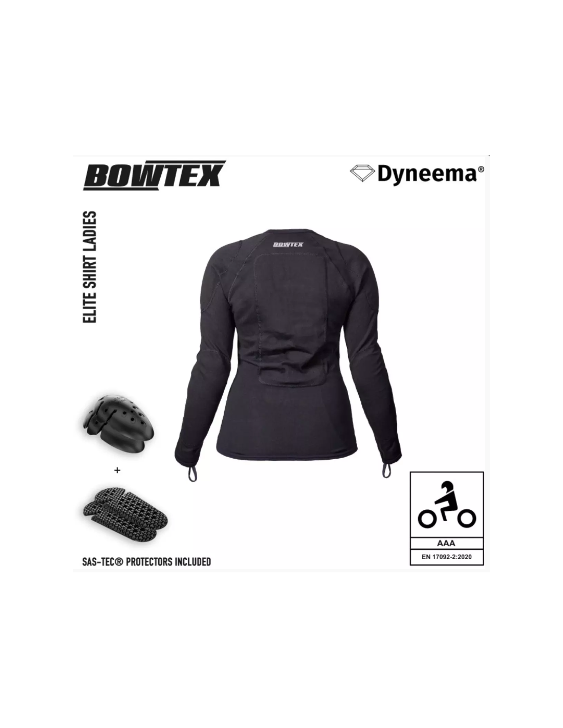 Bowtex vous présente l’Elite Shirt Femme V2, une sous-veste moto femme conçue pour vous apporter une protection élevée dans un format compact, léger et facile à superposer au quotidien. Certifiée CE AAA selon la norme EN17092-2:2020, elle associe une construction intégrale en tissu Dyneema®, des protections SAS-TEC niveau 2 incluses aux épaules et aux coudes, ainsi qu’une coupe spécifique femme avec bras plus courts et affinés, taille plus marquée et longueur réduite pour vous garantir un ajustement plus naturel.