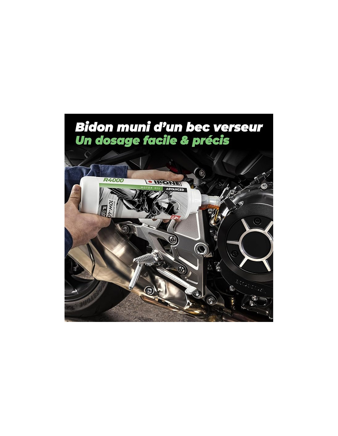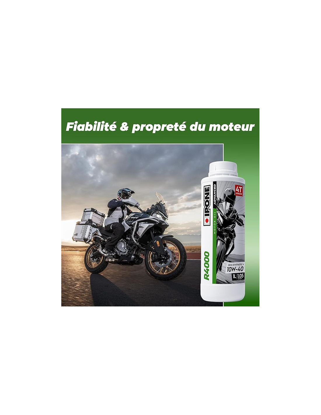 L'huile moteur Ipone R4000 10W40 est un lubrifiant semi-synthétique haute performance à base d'esters, spécialement conçu pour les motos 4 temps à usage régulier. Grâce à sa technologie Ester, elle offre une lubrification optimale et durable qui préserve le moteur en réduisant l'usure, améliore la stabilité thermique et prolonge la durée de vie du moteur. Son bidon avec bec verseur permet un remplissage simple, propre et précis.
